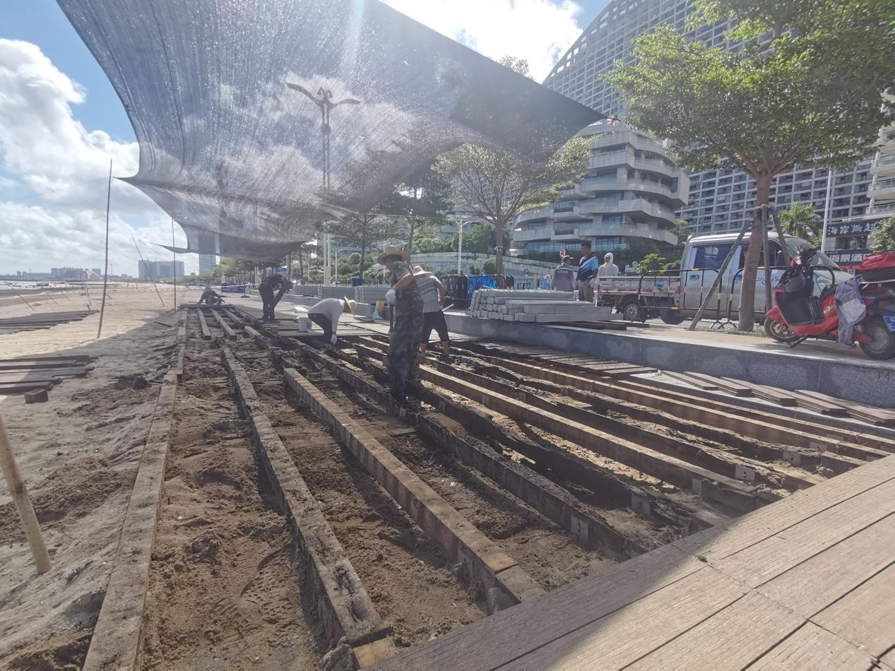 受海洋氣候及日照高溫影響,廉州灣大道木棧道出現(xiàn)多處防腐木龍骨受潮腐爛及面板松動、塌陷、脫空等問題。市委、市政府對此高度重視,市路港公司、相關(guān)政府部門積極作為、想方設(shè)法籌措維修資金,在7月初開始全面修繕木棧道--將已壞防腐木龍骨更換為混凝土龍骨。